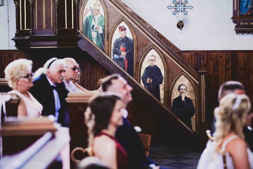 Sedno sprawy to, aby fotograf nie przeszkadzał, nie zasłaniał gościom, nie zdominował ceremonii w poszukiwaniu tego najlepszego ujęcia. Nie jest to łatwa sprawa, ale oczywiście wykonalna. Użycie różnorodnych kątów fotografowania, używanie różnych ogniskowych, obiektywów czyni, niemożliwe możliwym. Dlatego zawsze warto zadać fotografowi pytanie, jak widzi tę kwestię, jaki ma sprzęt i akcesoria fotograficzne, które umożliwią oddanie atmosfery, bez zbędnego ingerowania w przebieg ceremonii. Fotografowanie zza pleców pary, z boku ceremonii oraz na bliskim planie pozwoli stworzyć kompletną relację.